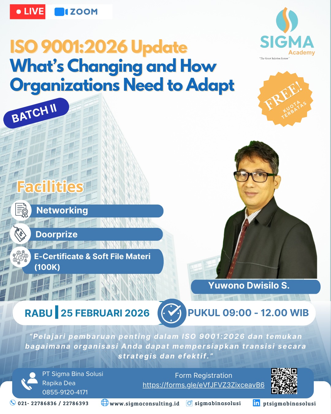 Ikuti Webinar ISO 9001:2026 Update β Whatβs Changing and How Organizations Need to Adapt bersama SIGMA Academy.